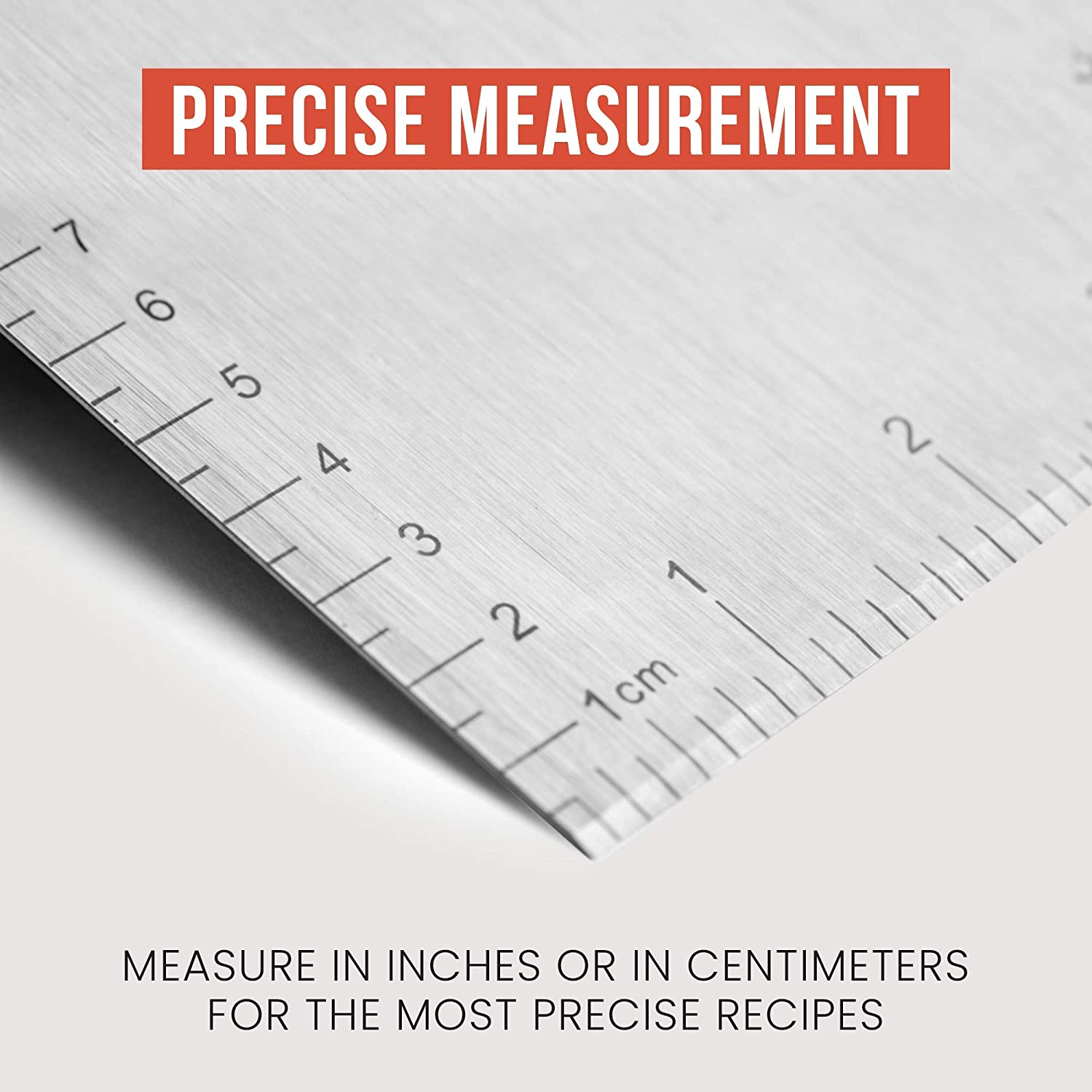 Le coupe-pâte de Chef Pomodoro dispose de mesures précises en pouces ou en centimètres, et même en millimètres ! Utilisez le meilleur accessoire pour réussir les recettes les plus précises. Unités métriques ou impériales, voici l’outil indispensable aux chefs boulangers et pâtissiers !